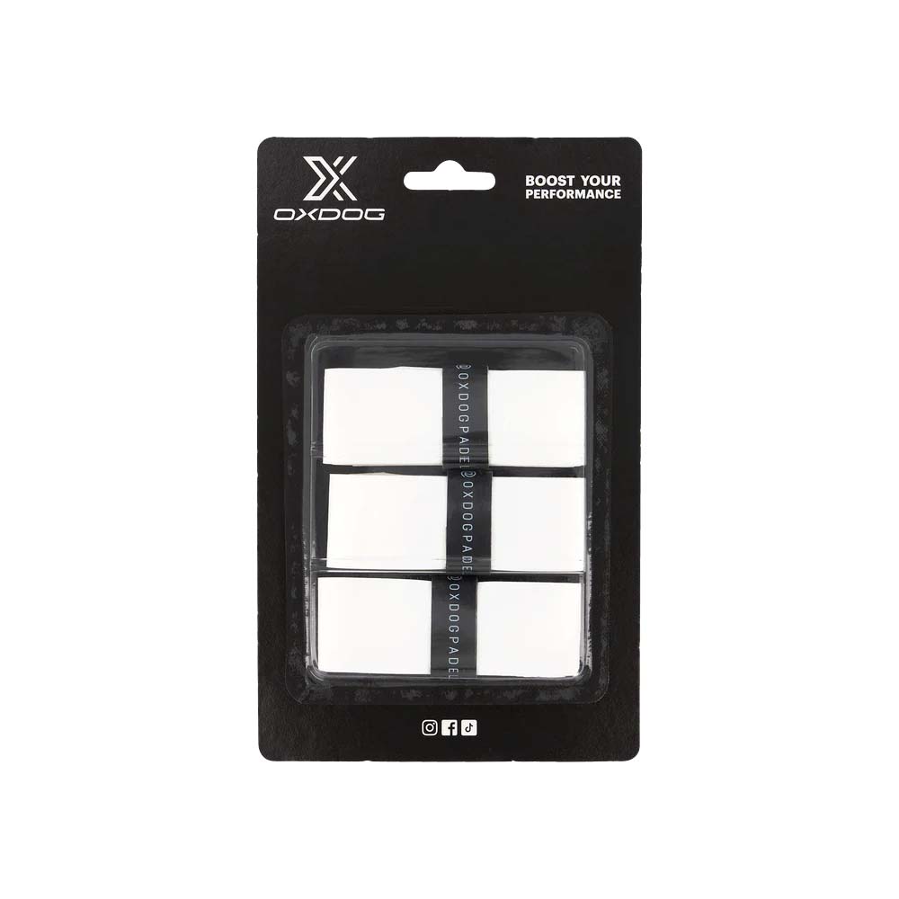 A 3-pack of Oxdog white OPTI padel overgrips built for a tacky, secure feel. Great elasticity and comfort for better handle control in fast rallies.